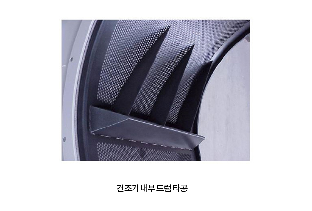 - 타사 대형 건조기의 경우, 대용량 세탁물을 보다 빨리 건조하기 위해 내부 드럼의 타공을 크게 제작하는 것이 일반적이지만, 이 경우 타공에 세탁물이 걸리거나 액세서리(단추, 지퍼 등)가 걸려 파손 및 손상될 위험이 높아집니다.